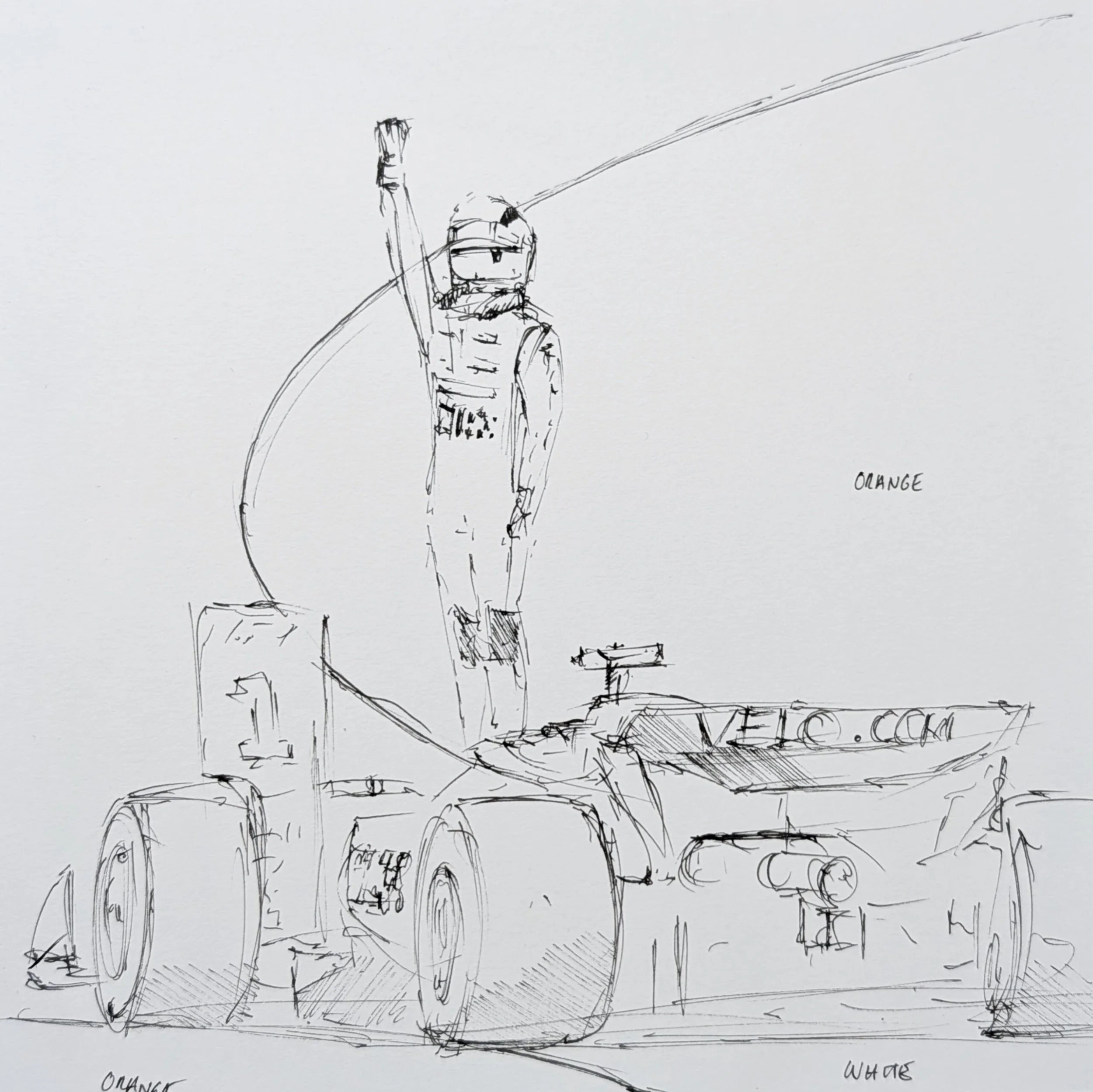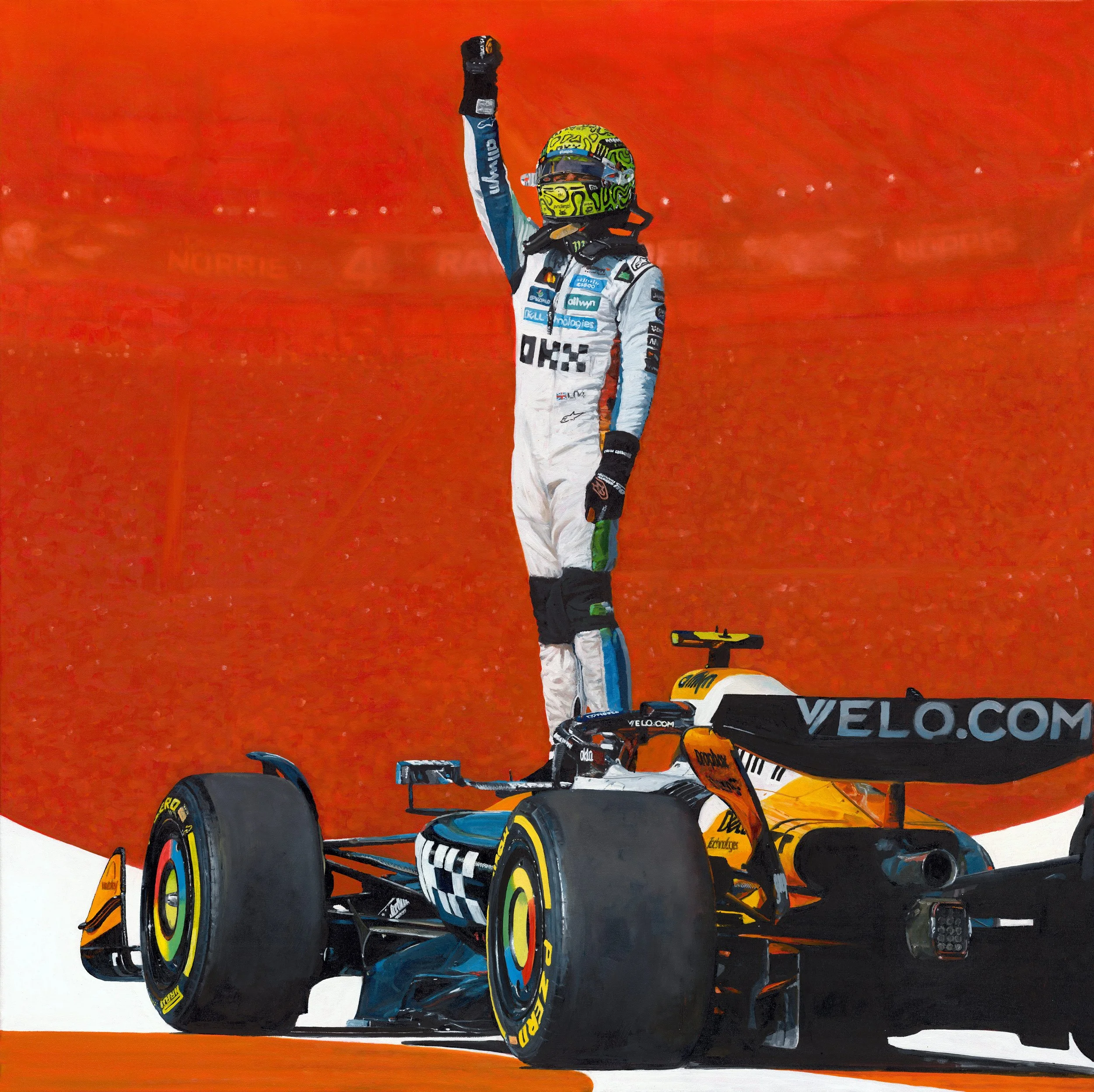 From the start, I knew the piece needed real energy and power. A McLaren-inspired orange felt like the natural direction, bold and fitting for the moment. I also planned to introduce sweeping white abstract forms flowing through the piece, knowing these would add motion and contrast within the composition. The intention was to place Lando firmly at the centre, giving the moment the space and focus it deserved, and drawing the viewer into the composition.